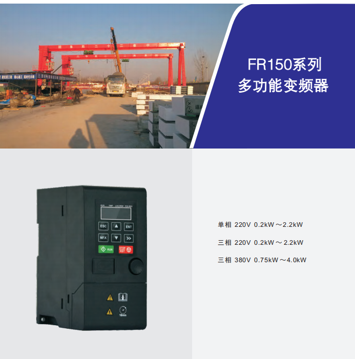 FR150系列是孚瑞肯电器新一代多功能通用变频器。产品具有先进的控制方式,实现了高转矩,高精度,高可靠 性,宽调速驱动。内置简易PLC,PID调节,可编程输入输出端子,RS485接口,模拟量输入输出等多种丰富的控制功 能。为设备配套,工程改造,自动化控制及特殊行业应用提供了高集成度解决方案。
